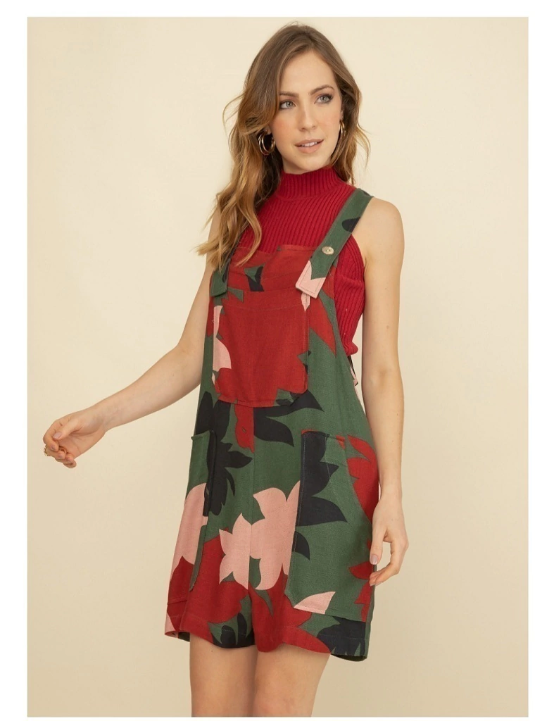 Macaquinho Jardineira confeccionada em Viscolinho, botões de coco, bolsos laterais, e bolsão na frente.